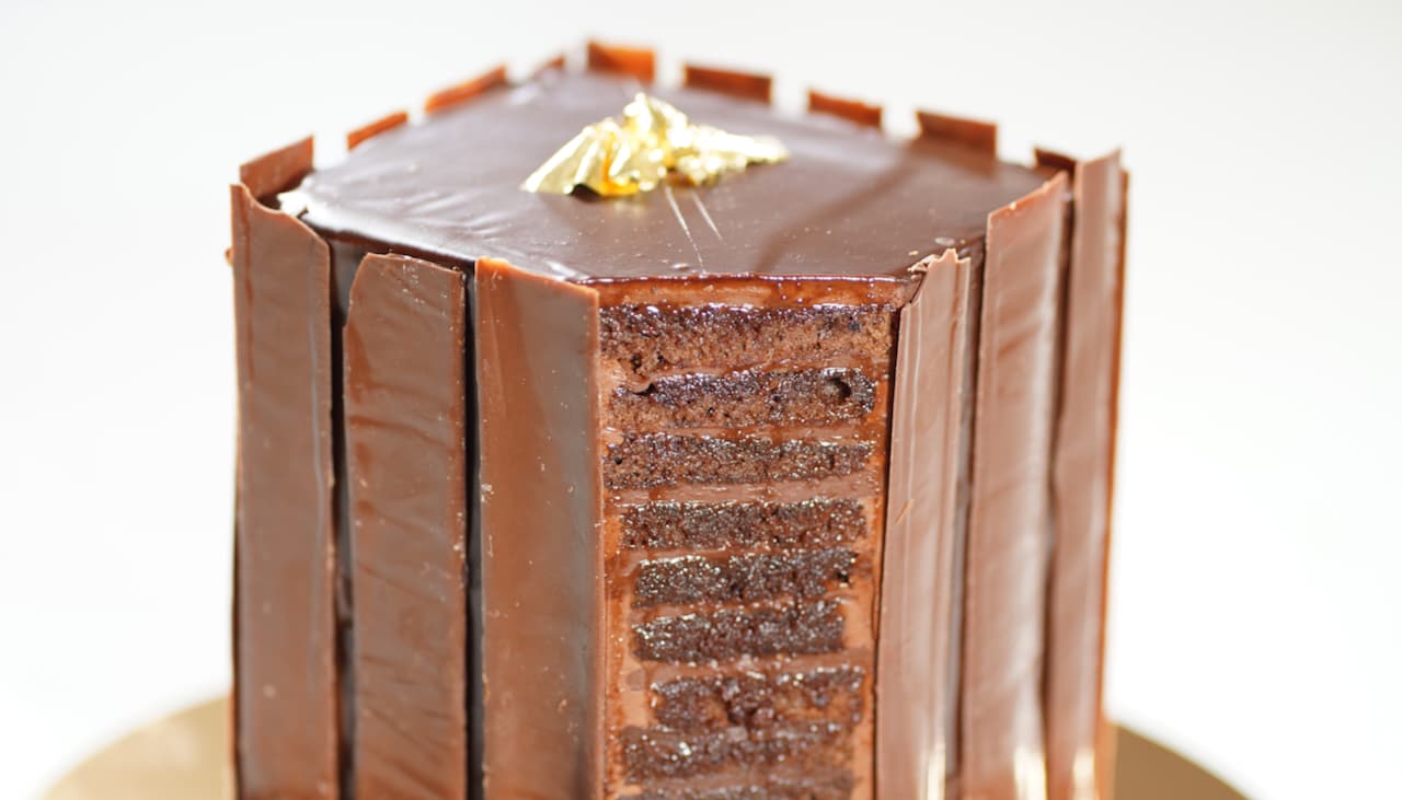 - Stick chocolate barks around the cake. Let the 24-layer chocolate cake tower to thaw completely before cutting.