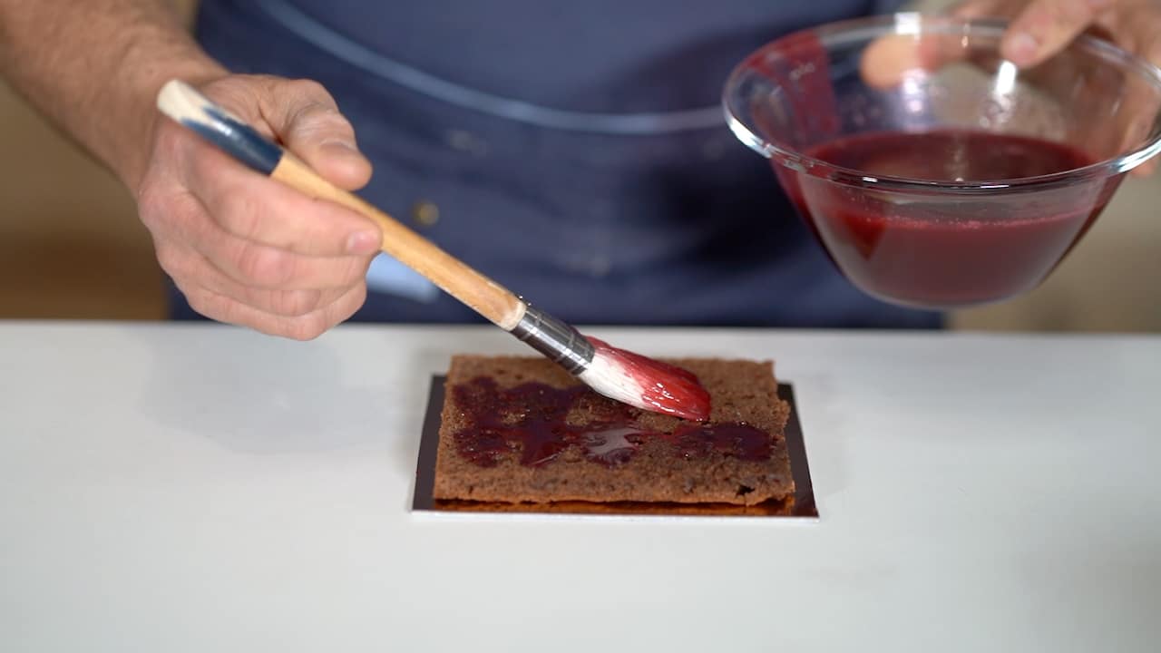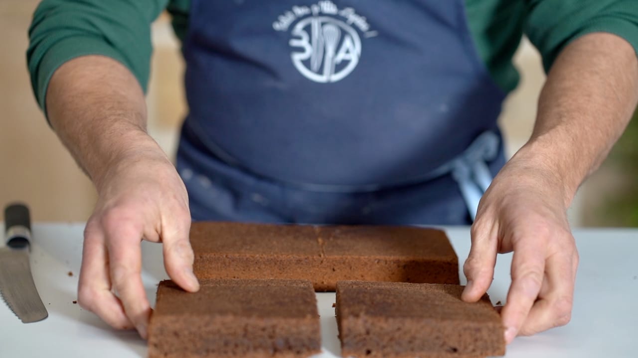 - To start, it is recommended to make the Pain de Gêne sponge cake a day in advance to allow it to rest and develop its flavors. In addition, the cake will be easier to slice. In a food processor, pulse powdered sugar and almond meal to create a fine powder known as tant pour tant (TPT). Essential in macaron making for example. It achieve a lighter batter texture ensuring smooth integration into the batter and a finer crumb structure. In a stand mixer fitted with the whisk attachment, beat the almond-sugar mixture and eggs on high speed for approximately 10 minutes until light and fluffy. Meanwhile, sift together flour, cocoa powder, and baking soda to ensure a smooth and airy texture in the final cake. In a large pastry bowl, gently fold one-third of the egg mixture with melted butter, then add the sifted powders. Then fold in the remaining batter until fully incorporated. Pour the batter into the prepared cake pan.