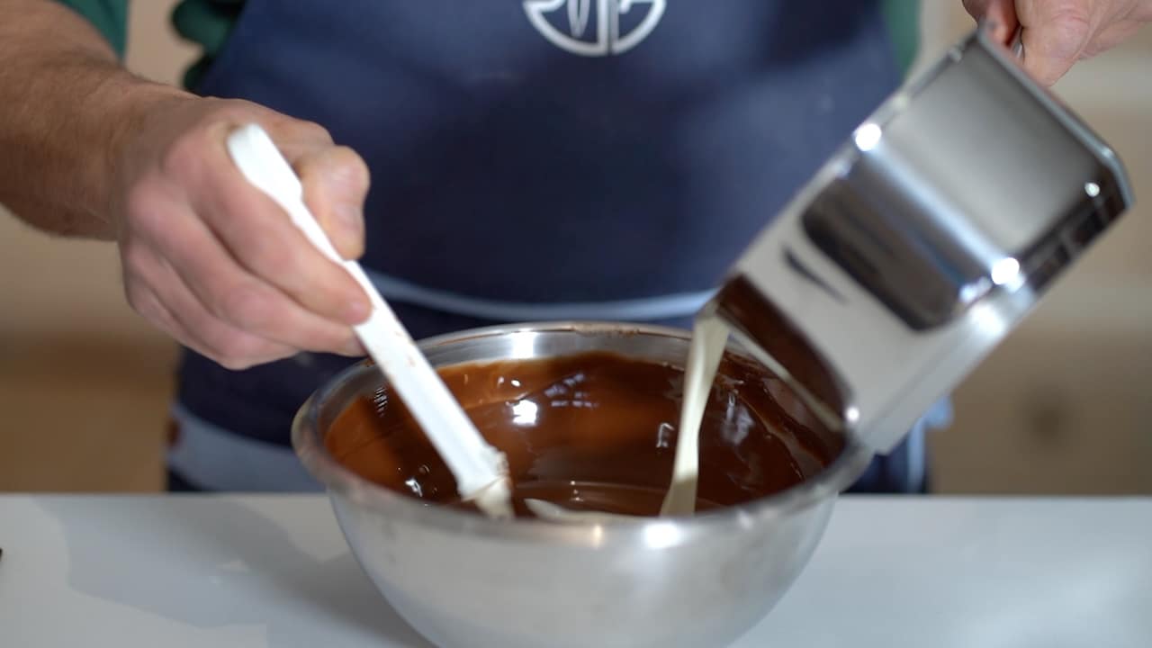 - Chop the chocolate and melt it in a bain-marie, stirring occasionally. Be careful not to overheat the chocolate; remove it from the bain-marie as soon as it is melted. Meanwhile, gently heat the heavy cream without bringing it to a boil.