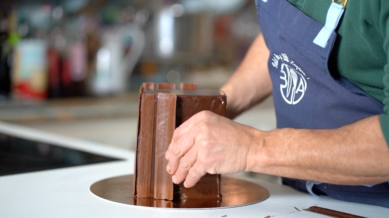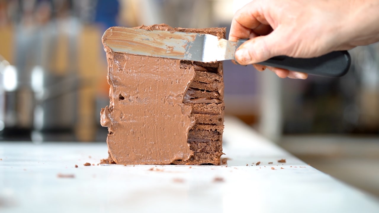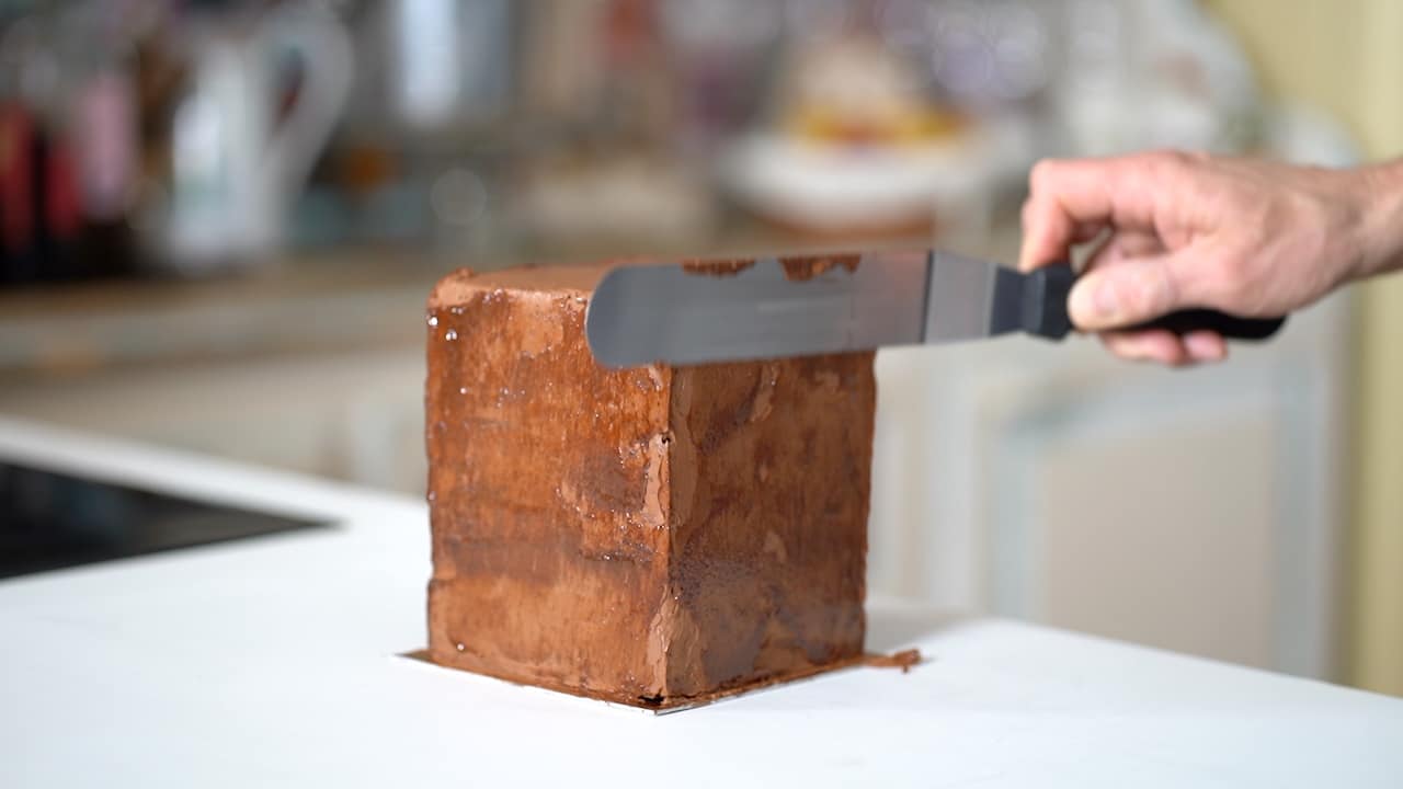 - Heat your large offset spatula and smooth out the chilled cake. Place the chocolate tower in the freezer.