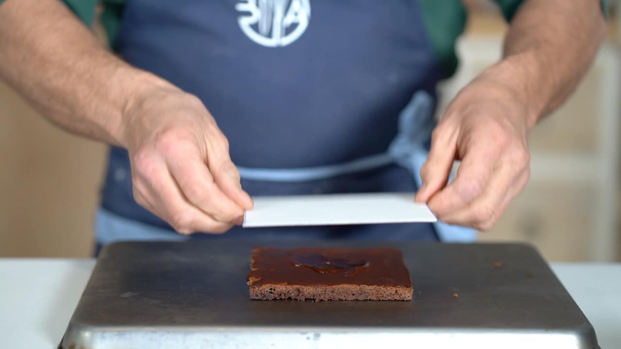 - Trim the edges of the cake flush with the board to ensure a smooth glazing process.