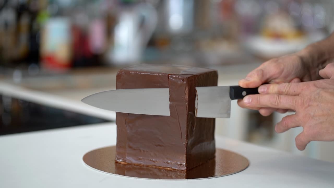 - Heat the knife blade in hot water or run it quickly over a flame. Slice off one corner of the chocolate cake tower.