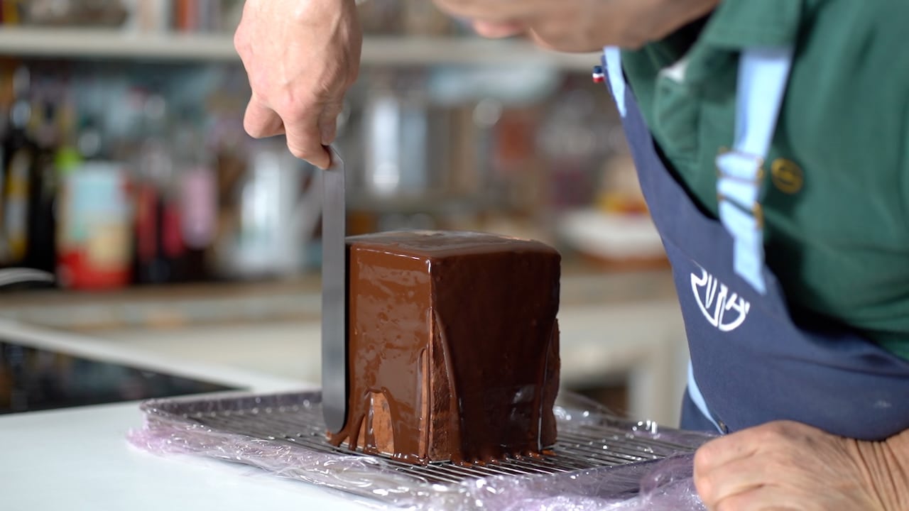 - Prepare a rimmed baking tray lined with plastic wrap. Set the frozen cake on a cooling rack positioned over the tray to catch excess glaze. Heat the chocolate glaze to a precise 108°F/42°C. Starting from the edges, pour the glaze and work toward the center.