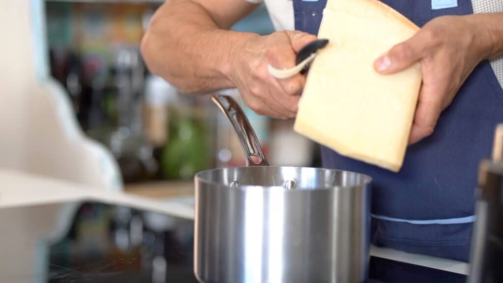 - Add parmesan cheese in the reduced sauce. Remove from the heat, and drop in the egg yolk. Emulsion the sauce using the high powered blender. Season with salt and pepper to taste.