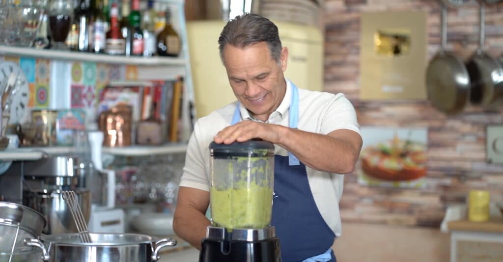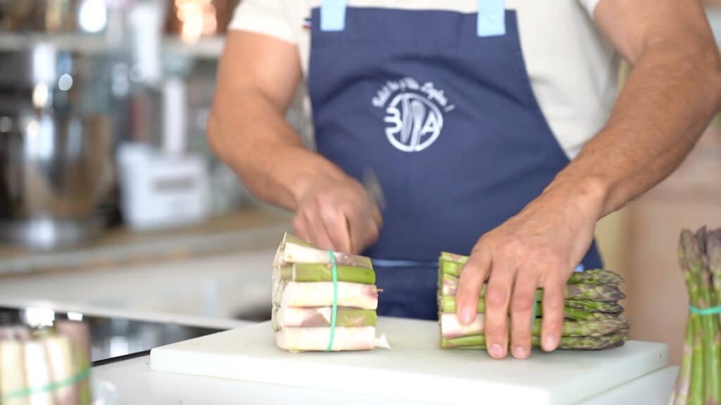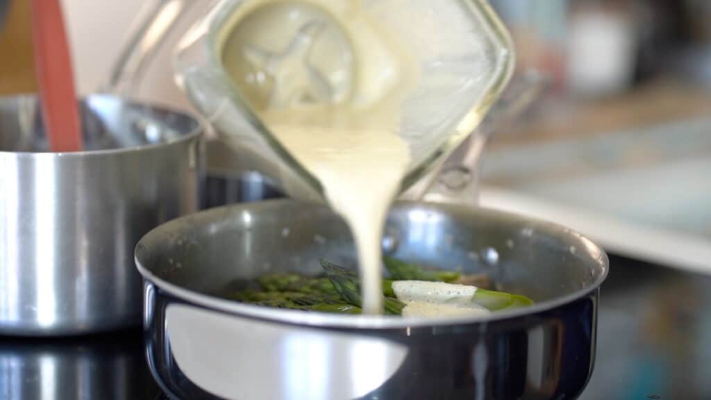 - Put the cooked mushrooms and asparagus back to the sautoir, and glaze them with the blended sauce. Keep on low heat until ready to serve.