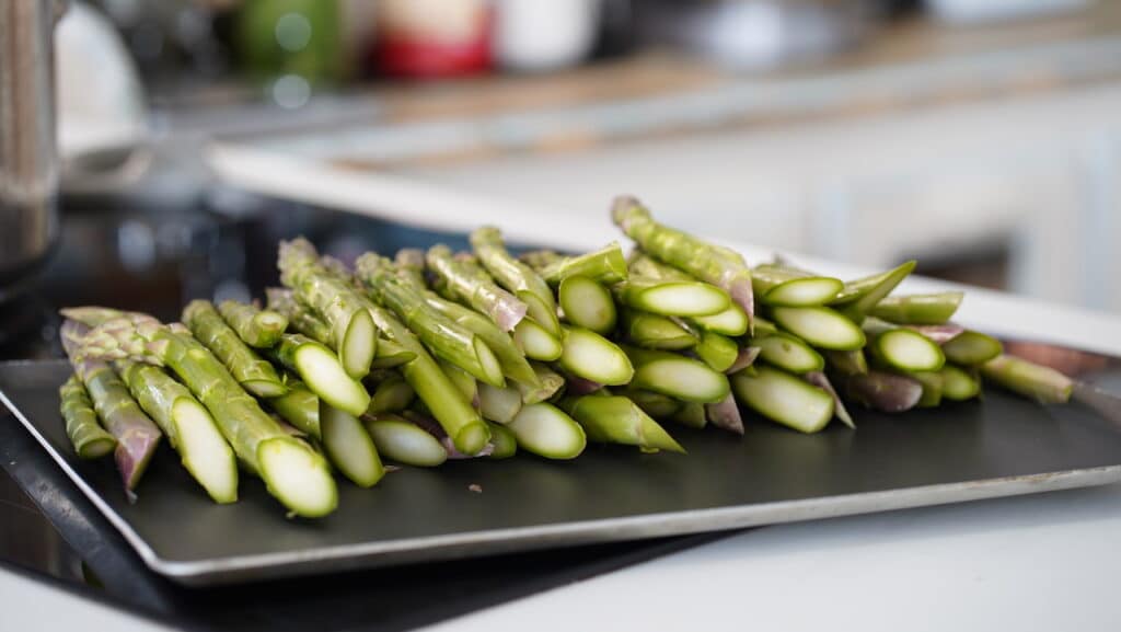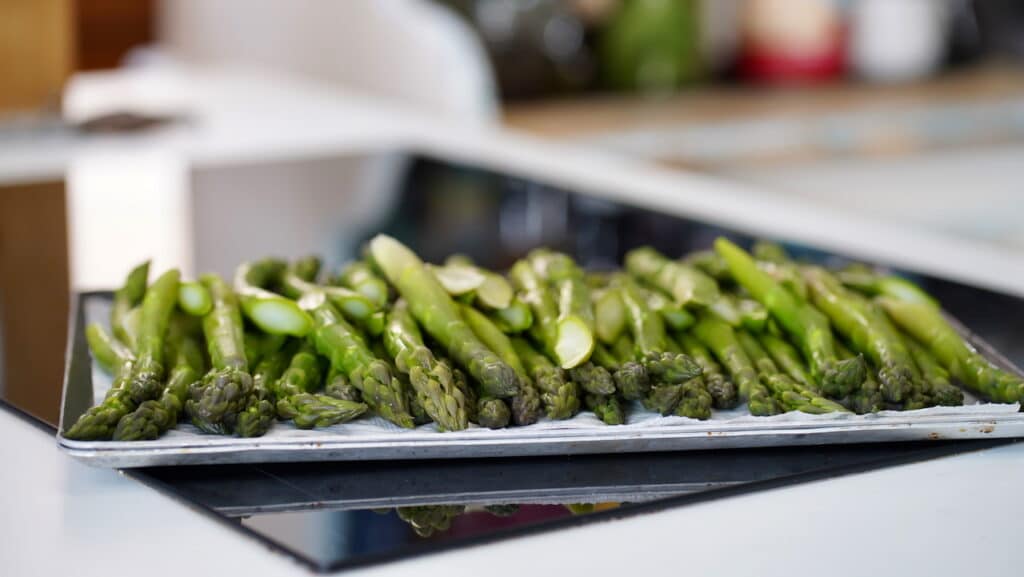 - Lay asparagus onto a tray lined with paper towels – keep greens refrigerated for up to 3 days.