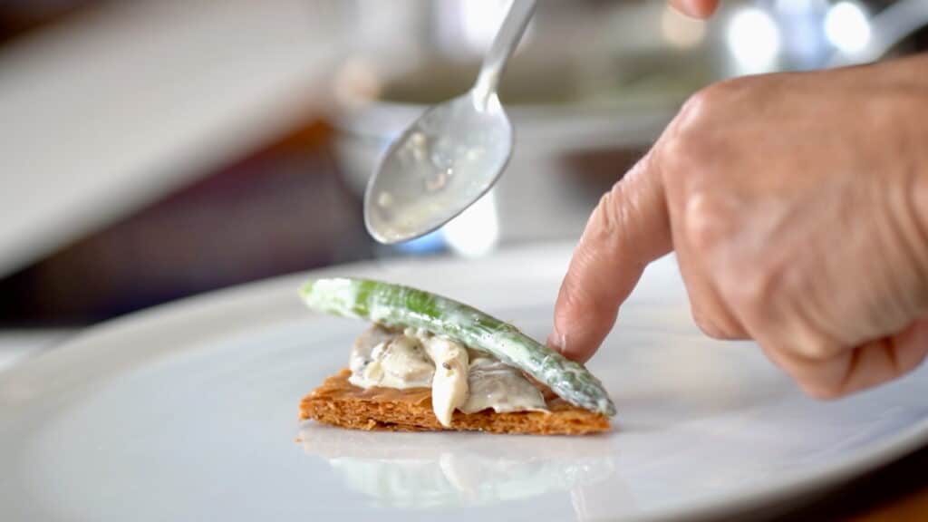 This asparagus mille-feuille is a savory reimagining of the classic Napoleon—a decadent twist on the famous pastry cream-filled dessert. Picture this: delicate, flaky layers of golden, buttery puff pastry, crisp yet tender, stacked high with a luscious filling of creamy oyster mushrooms infused with shallots. Between each layer, vibrant asparagus spears add a fresh, earthy sweetness and a satisfying crunch. The dish is then finished with a touch of toasted pistachios and a drizzle of reduced balsamic. Every bite is a symphony of textures—rich, velvety mushrooms against the shattering crispness of pastry, all brightened by the verdant pop of asparagus. Elegant yet comforting, this dish is a celebration of contrasts, proving that indulgence can be both refined and deeply satisfying.