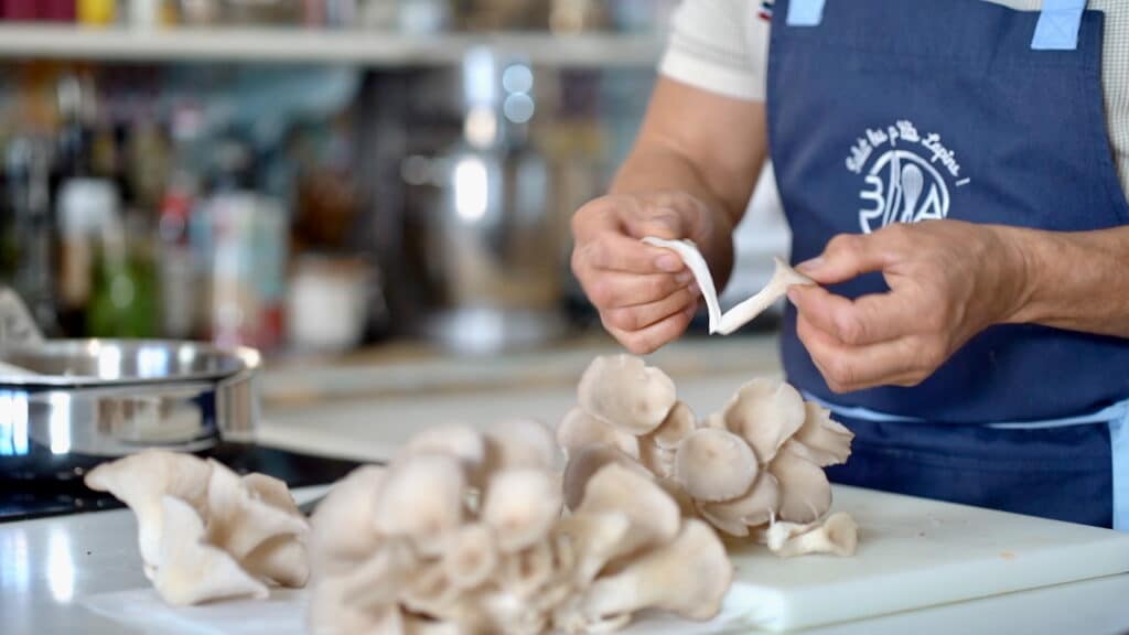 - To clean oyster mushrooms, use a damp cloth or a soft brush to gently wipe away dirt. If necessary, quickly immerse oyster mushrooms in water (heads down) and reverse over a tray lined with paper towels to drain. Cut off the tough base of the cluster where the stems join. Save trimmings for stock. Separate larger mushrooms into individual pieces or leave smaller clusters whole. Tear larger mushrooms in 2 or 3.