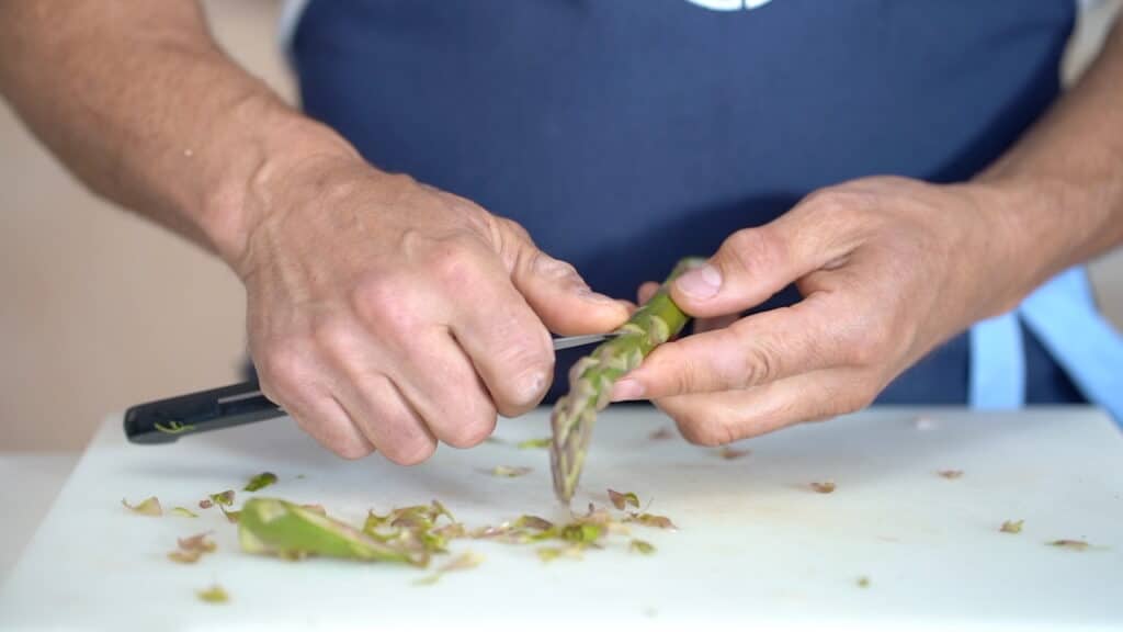 - Add the prepared asparagus in the boiling water. As soon as it comes back to boil, cook asparagus for 3 to 4 minutes, then quickly transfer it to an ice bath. This is how to cook asparagus properly so that it is crisp-tender and perfectly green. After 5 mins or so, drain.