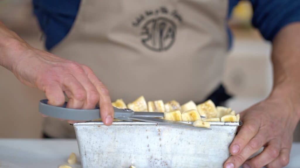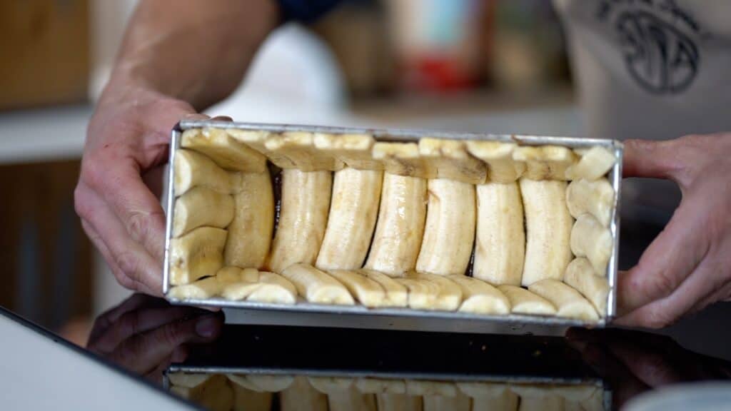 - Peel the firm bananas and carefully cut them lengthwise in 2 to cover the bottom pan, and cut into 3 to cover the sides.