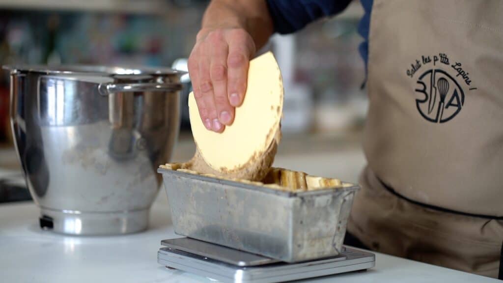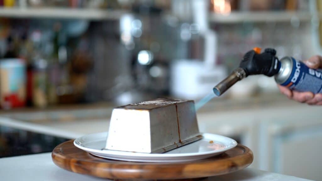 - Freeze the chilled cake for an hour. Run an offset spatula around the edges. Invert banana bread onto a serving platter. Heat up bottom mold with the kitchen blowtorch, and carefully remove the mold.