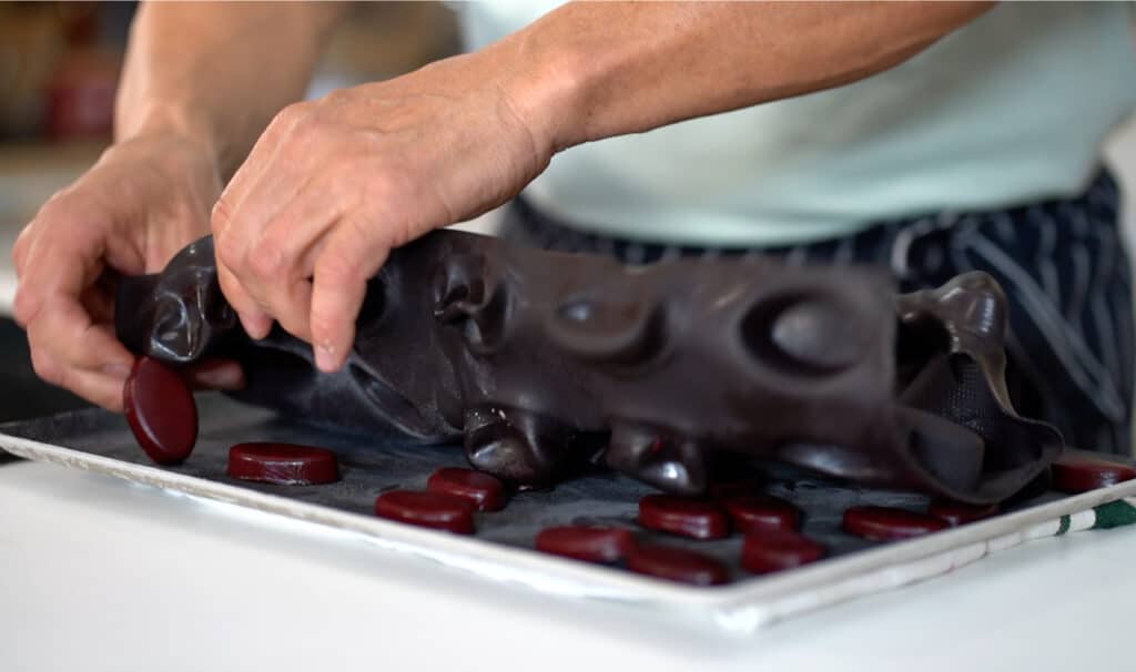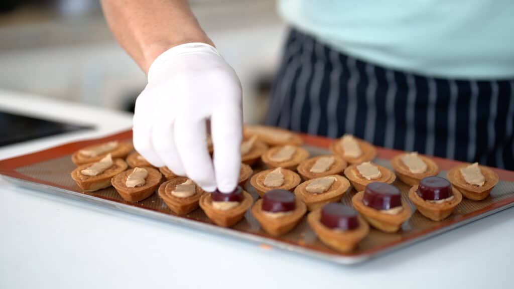 - Grab the baked barquettes from the freezer. Spread some of the chestnut filling on each tartlet. Top with the frozen cassis pate de fruit; keep frozen.