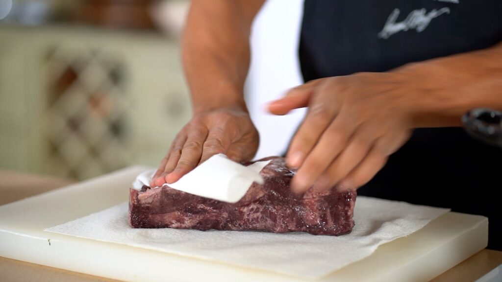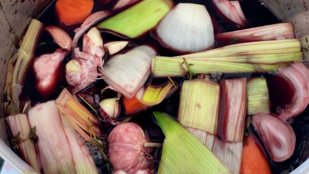 - When ready to cook, remove the meat from the marinade. Strain the liquid through a sieve, reserving the wine for deglazing or another use, and discard the vegetables and herbs. Thoroughly pat the meat dry with paper towels before searing.