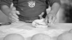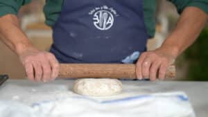 - Starting from the middle with your rolling pin, with a controlled pressure begin to flatten it but not entirely—keep about a third of the dough intact creating a little bump. Brush of excessive flour if so.