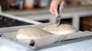 - Plan to bake 2 loaves (dust flour over) every 50 minutes (allowing 25 minutes for baking and about 25 minutes for the pizza stone to reheat to 250-260ºC). To prevent the remaining breads from over-proofing while waiting to be baked, the 6 other loaves should be kept in the refrigerator.