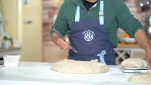- Flour the dough and work surface. Turn the bowl over (now, the skin is down), and flour the surface of the dough. With the help of the large triangle dough scraper, cut the dough into eight 500g or ten 400g portions keeping skin side down for now.