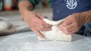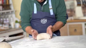 - Uncover the loaves. Lightly flour them and the cleaned countertop. Grab the first loaf and flip it over (seam side up). Dust flour over.