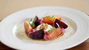 The elements are bound not by a simple vinaigrette, but by a “gastric red mayonnaise’’. The overall effect is one of elegance: the smooth fragrance of what the chef calls the ‘cardinal purée’ its an unctuous base made of confit beetroot in oil, blended with raspberry puree, and a touch of raspberry vinegar, offering a subtle sweet-and-sour tension that clings to every ingredient. Set out as a crudité appetizer, it is a vibrant beginning to a meal, and a complete discovery waiting to happen.