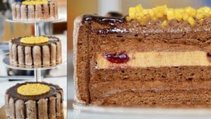 In the world of charlotte cakes, the combination of flavors is as limitless as your imagination, yet the architecture remains timelessly elegant. Layers of delicate sponge and airy mousse, all fenced within a neat row of ladyfingers, create a dessert that is as beautiful as it is structured. This old-fashioned cake pays homage to that classic form but comes with a spectacular bonus: a luscious, tropical mango crèmeux, its heart bursting with hidden pockets of tart raspberry coulis. This golden center is gently sandwiched between layers of a light, bittersweet chocolate mousse, a pairing that dances between rich and refreshing. The final touch is a spectacle in itself—a glossy, dark chocolate jelly glaze cascading down the sides, catching the light and dripping seductively between each and every ladyfinger. To crown this masterpiece, an elegant disk of perfectly diced mango brunoise adds a final whisper of color and sophistication. Let’s turn simple ingredients into an unforgettable journey and make your next event a truly delicious memory.