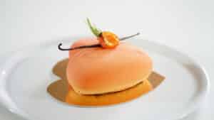 This Heart Apricot Entremet is the ultimate harmony of texture and flavor, crafted to celebrate love on Valentine’s Day. At its foundation lies a delicate pistachio dacquoise—airy, nutty, and reminiscent of a perfect macaron shell. Above it, a layer of pistachio crunch adds a satisfying bite, its toasted richness contrasting beautifully with the tender apricot jelly that dissolves like a whisper on the tongue. Encasing it all is a cloud-like rosemary-vanilla mousse, its subtle herbal sweetness weaving through the bright, sun-kissed notes of apricot. Each bite is a dance of contrasts—crisp and creamy, fruity and floral—a dessert as enchanting as the day it honors.