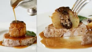We use Espérence apples, a variety known for its floral perfume and firm flesh that holds its shape beautifully in the oven. Each one is carefully cored, creating a cavity for a rich, textured stuffing. Plump prunes, having soaked in warm apple juice until soft, are chopped and combined with a deeply flavored puree of Black Mission figs and the earthy crunch of walnuts. This mixture is packed into the heart of each apple. The stuffed apples are then anointed with a light drizzle of local honey, and a knob of butter is placed on top of each one before they slide into the oven. As they roast, the honey and butter meld with the apple’s juices, creating a fragrant, bubbling syrup. The roasted apples are pulled from the oven, their skins gently caramelized. From the roasting pan, a generous drizzle of that glorious, honey-kissed apple syrup is lifted and stirred directly into the reduced pork sauce. The savory depth of the meat juices is suddenly elevated, brightened, and made whole by the sweet, fruity, and floral notes from the apples.