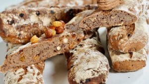 In our ongoing exploration of dark rye, we move beyond the classic round loaf to create something both playful and profoundly satisfying: the Wholemeal Rye Fruit Bread Stick. Imagine a demi-baguette, not of airy white flour, but one with the dense, earthy soul of wholemeal rye and natural leaven. On one tray, you might find a line of sticks nestled with the sunny, aromatic combination of Walnut and Lemon. Alongside them, another tray holds the classic, comforting union of Hazelnut and Raisin. The sweet, chewy bursts of raisin are grounded by the toasted, buttery crunch of hazelnut, creating a flavor profile that is both nostalgic and wonderfully complex. But the possibilities, as any baker knows, are truly endless. Let’s get started!
