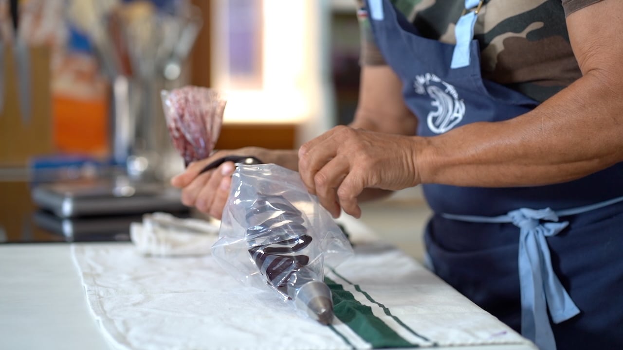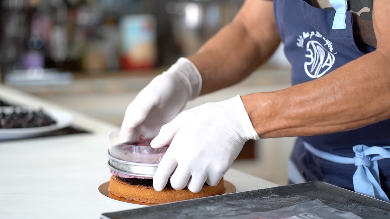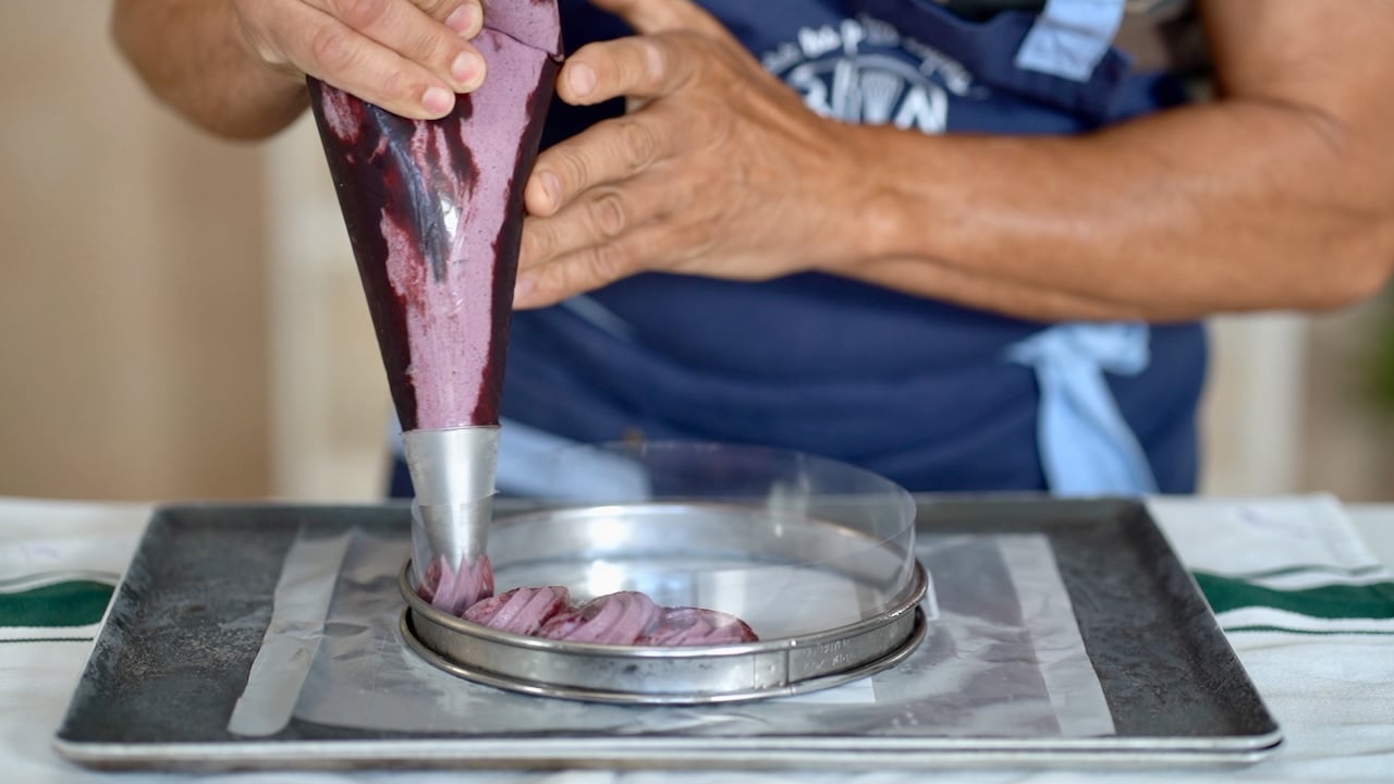 - Fit a piping bag with the large open star tip. Coat the inside of that bag with some of the chilled blueberry marmalade.