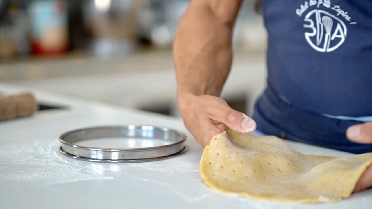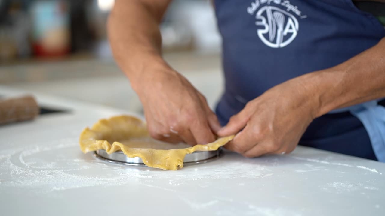 - Immediately, pull the prepared baking tray-tart rings from the freezer (one at the time)...