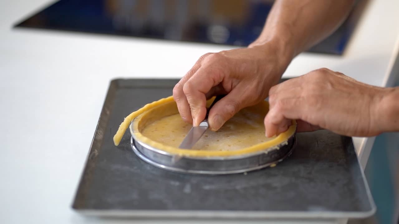 - Trim excess dough with the rolling pin, and lift edges upward. Freeze tart shell for 10 minutes.