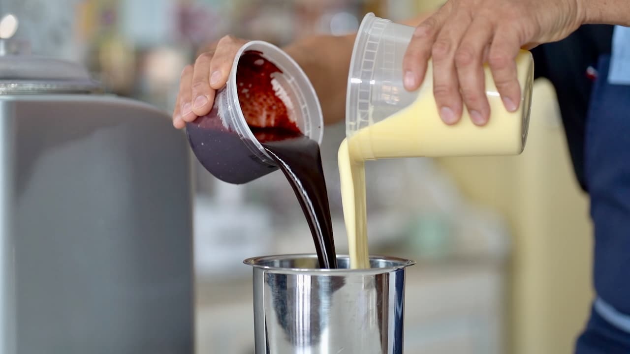 - At 95ºF/35ºC, add the egg yolks and inverted sugar. At 113ºF/45ºC, add the remaining sugar combined with the stabilizer. Mix.