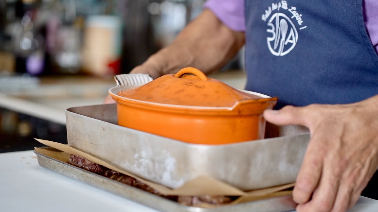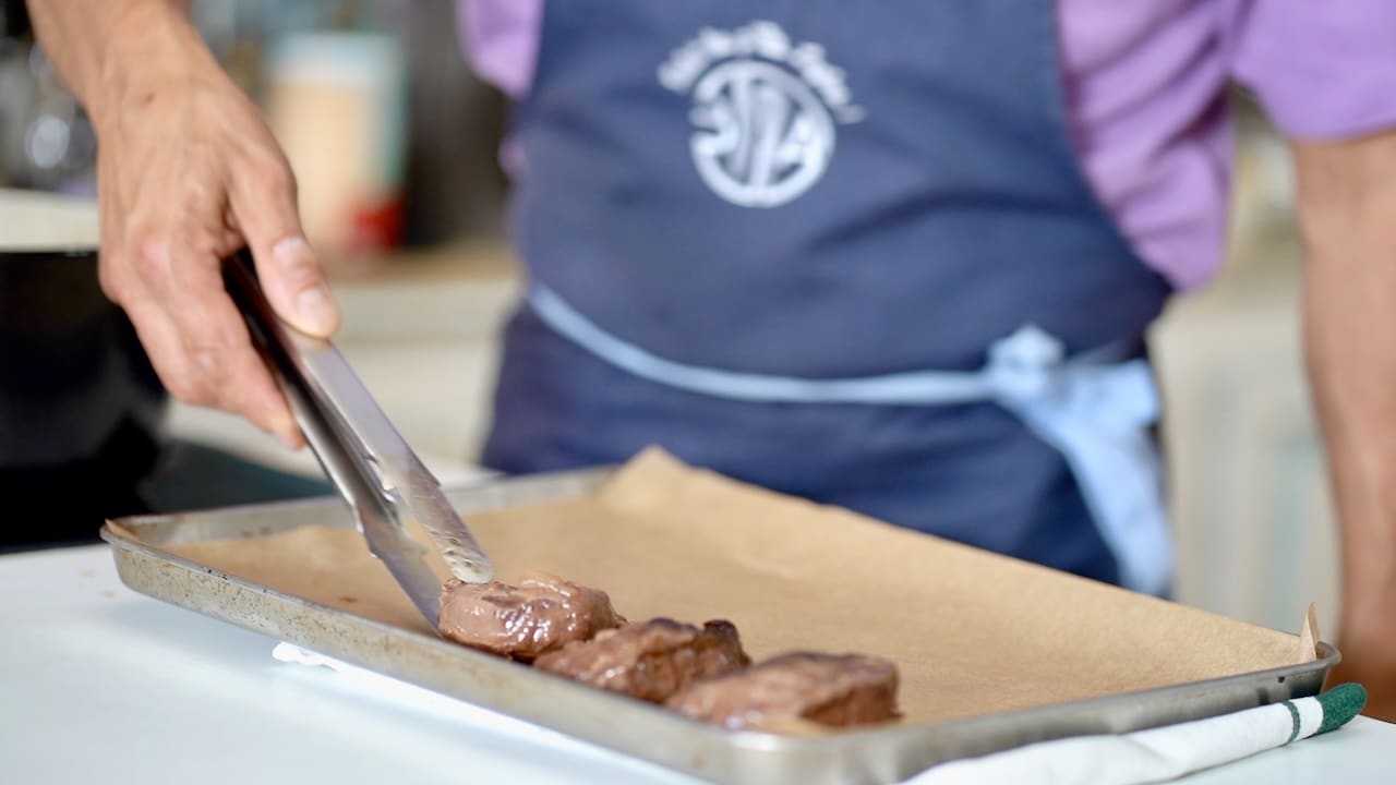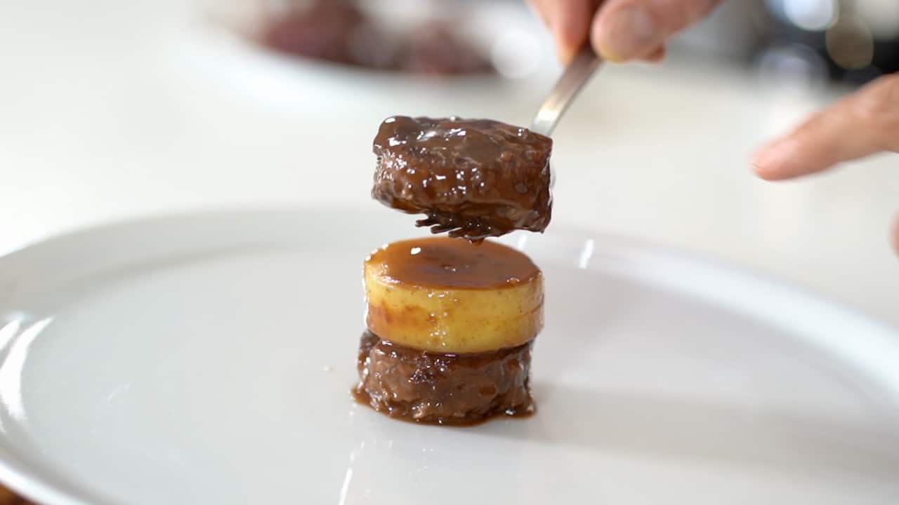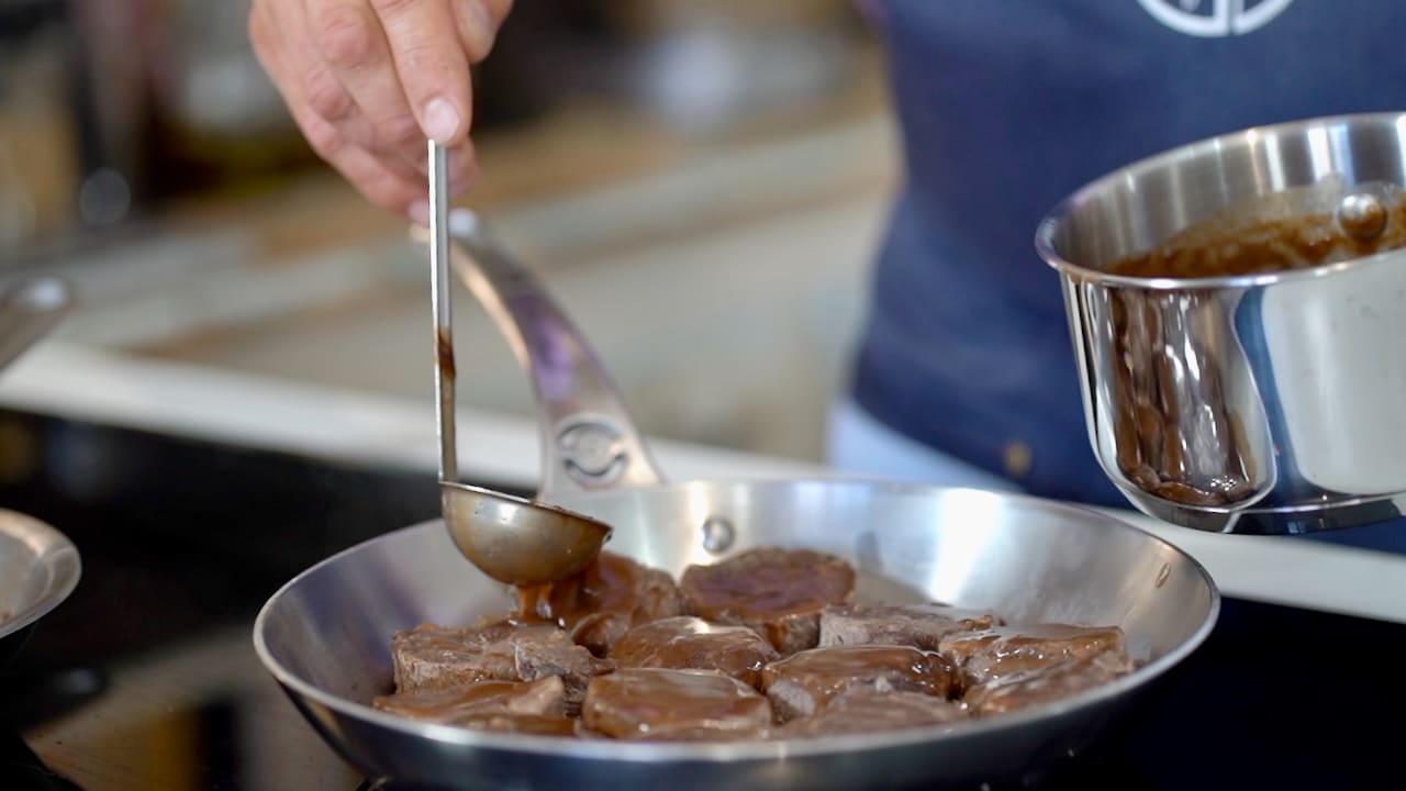 Our work began yesterday. The cheeks were nestled into a deep pot with red wine and rich stock, then left to slowly braise for hours until they reached that perfect state of fall-apart tenderness. But we didn’t stop there. To achieve an elegant, clean slice, the succulent meat was carefully packed, put under a firm press, and left to chill overnight. This morning, we’ll unmold and cut them into gorgeous, compact palets—medallions of concentrated flavor.