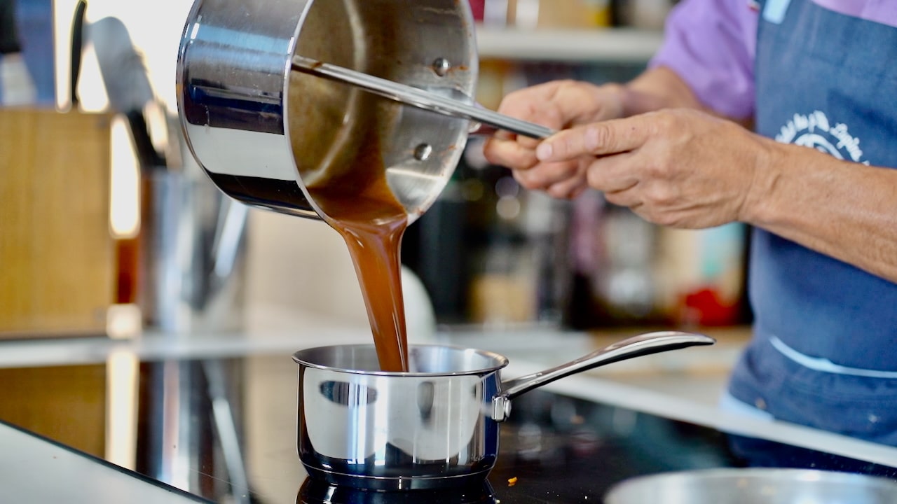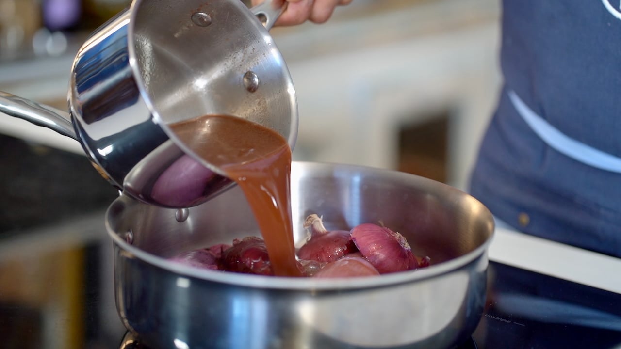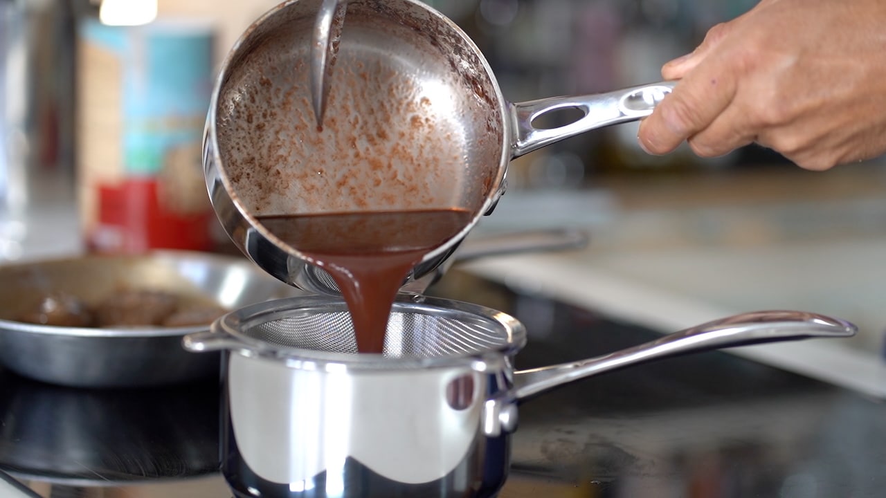 - Skim off and discard the solidified fat. Reduce the cooking liquid from the braised cheeks to 2 cups/500g.