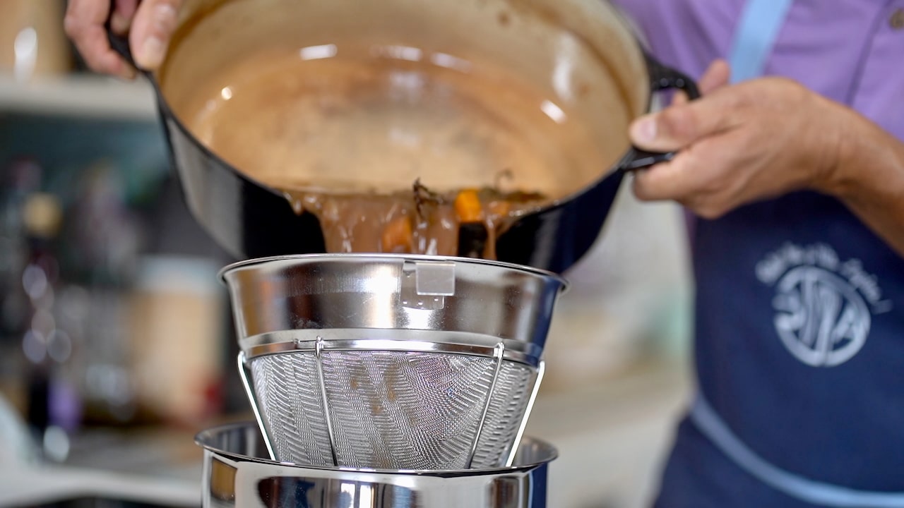 - Pass the cooking liquid through a sieve, and chill. Discard solids.