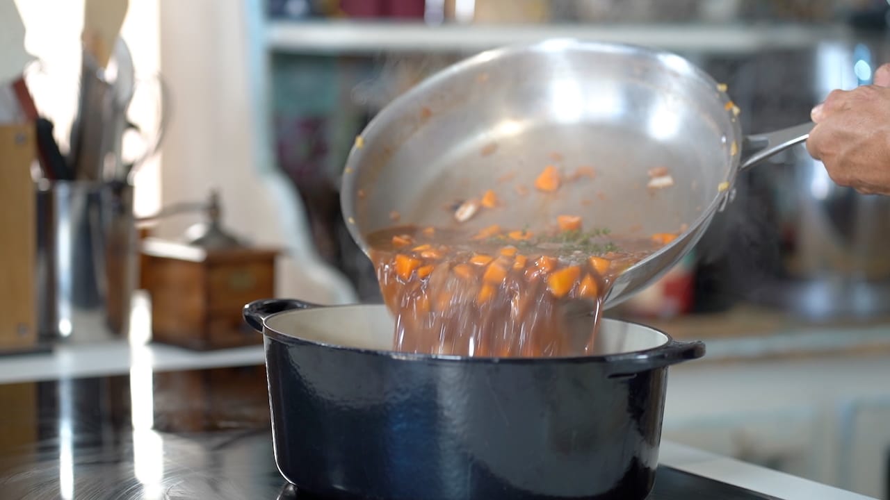- Add wine, stock and herbs and bring to a boil. Turn off the heat and set aside.