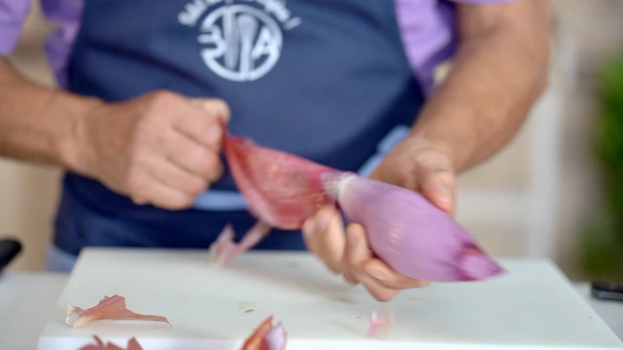 - Peel onions. Save some onion confit for garnishing. Use the remaining red onion flesh to make the onion spread.