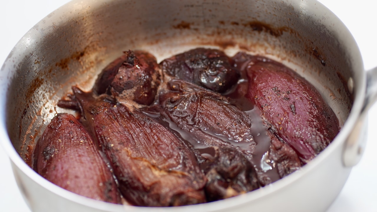 - Pass the reduced grape-balsamic cooking liquid through a sieve. Reduce to sirupy consistency réduire à glace. Use some of this reduction to season the baked pork samosa mixture and the sauce.
