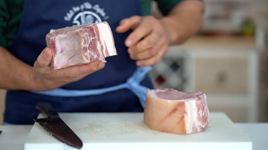 - Cut the chilled pork cheeks into 5.5cm Ø rounds. Save scraps for the carrot-ginger baked pork samosas. Keep meat refrigerated.