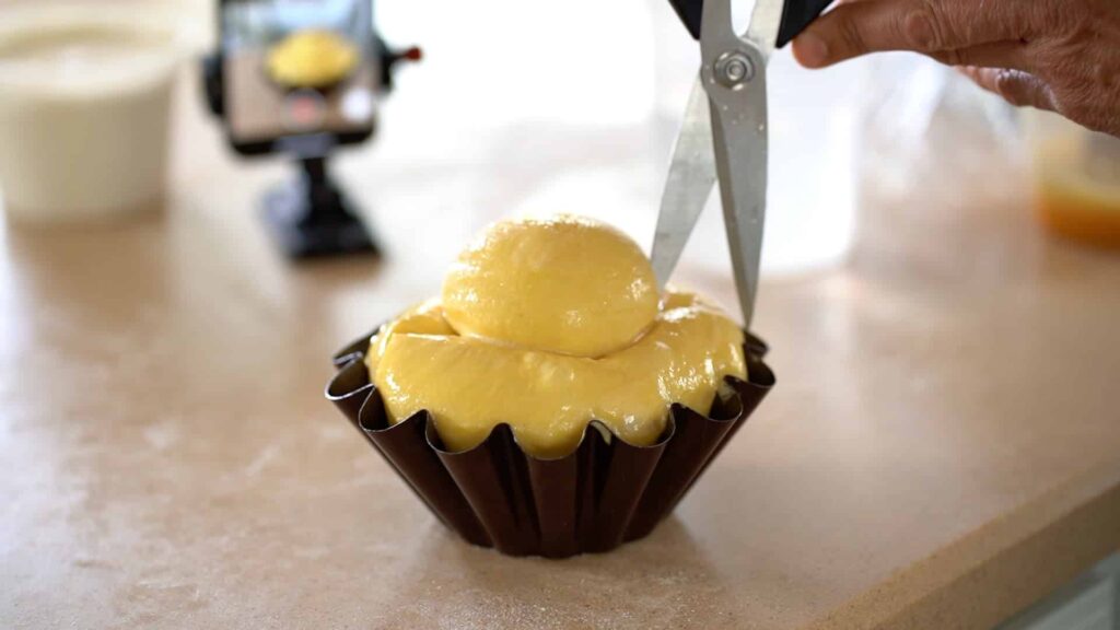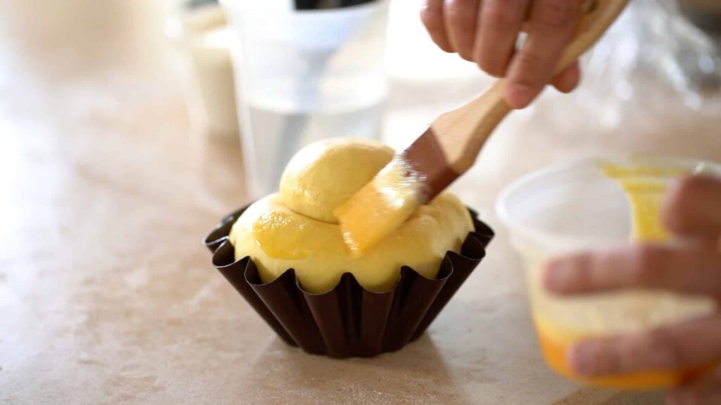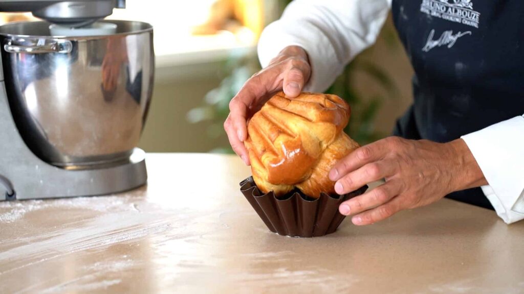- Preheat fan oven to 325ºF/160ºC. Bake for about 35 minutes or until the brioche is golden brown. Let cool for 5 minutes. Carefully remove brioche from the mold and place it upside down inside the mold, cool completely.