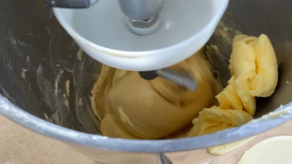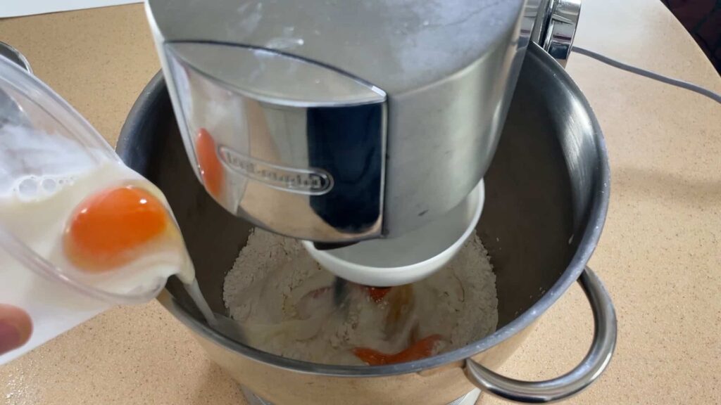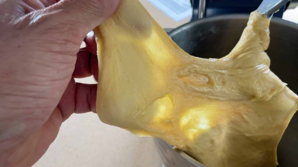 - Add eggs, and milk – increase speed to medium and mix for 20 min, or until dough comes off the sides of the bowl and becomes elastic. Meanwhile, workout the cold butter to make it supple. Lower speed and throw in butter.