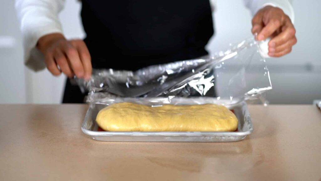 - Kneading causes the gluten strands to get stronger and longer. The internal temperature of the brioche dough should be around 77/81ºF(25/27ºC). Without adding any extra flour, transfer dough onto the work surface. Shape dough into a round, and place in an oiled container. Cover and let the first fermentation going for an hour or until double in size. Deflate and yet without the addition of flour, and shape into a tight and flat log. Place brioche onto a frozen baking tray lined with a silicone baking mat, wrap up in plastic film and freeze for 20 minutes. This will slow down the fermentation. Then place brioche in the refrigerator overnight to rest. After kneading and rising, it's best to let the brioche dough chill in the fridge overnight. Shaping the cool dough is easier than trying to coax the warm dough into submission — in addition, the slow overnight rise develops the flavor, and improves the strenght and texture of the brioche.