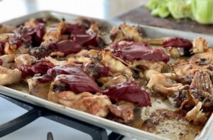 - Preheat oven to 425ºF/220ºC. Lower temp to 400ºF/200ºC if using a fan oven. Spread chicken parts onto 2 large oiled baking tray (do not use wax paper or baking mat; it may not caramelize well. Break chicken parts with a cleaver; this will ease the release of collagen during cooking. The addition of pork rind in the chicken stock and demi will add more collagen to the final product improving thus its viscosity.
