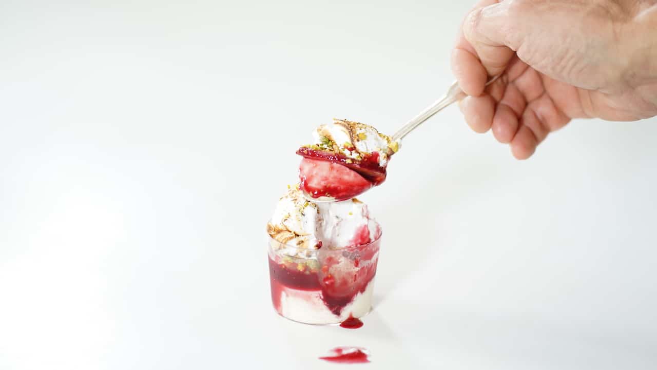- Note: In cups the amount of gelatin in the red fruit soft jelly should be reduced by half. Layers are: 55g mousse, 15g red fruit soft jelly, 10g sponge, 20g meringue and toasted crushed pistachios. Enjoy!