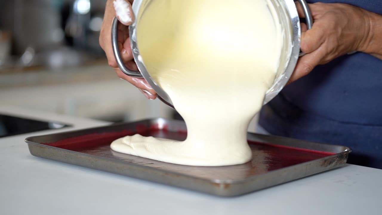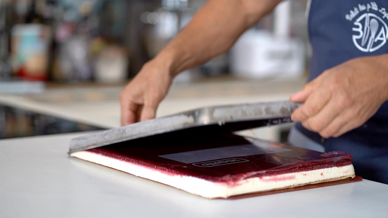 - Next, top cake with a large cutting board or cake board, and reverse. To ease un-molding, warm up the bottom tray baking using your hair dryer. Remove the baking tray and the plastic that touches the red fruit soft jelly.