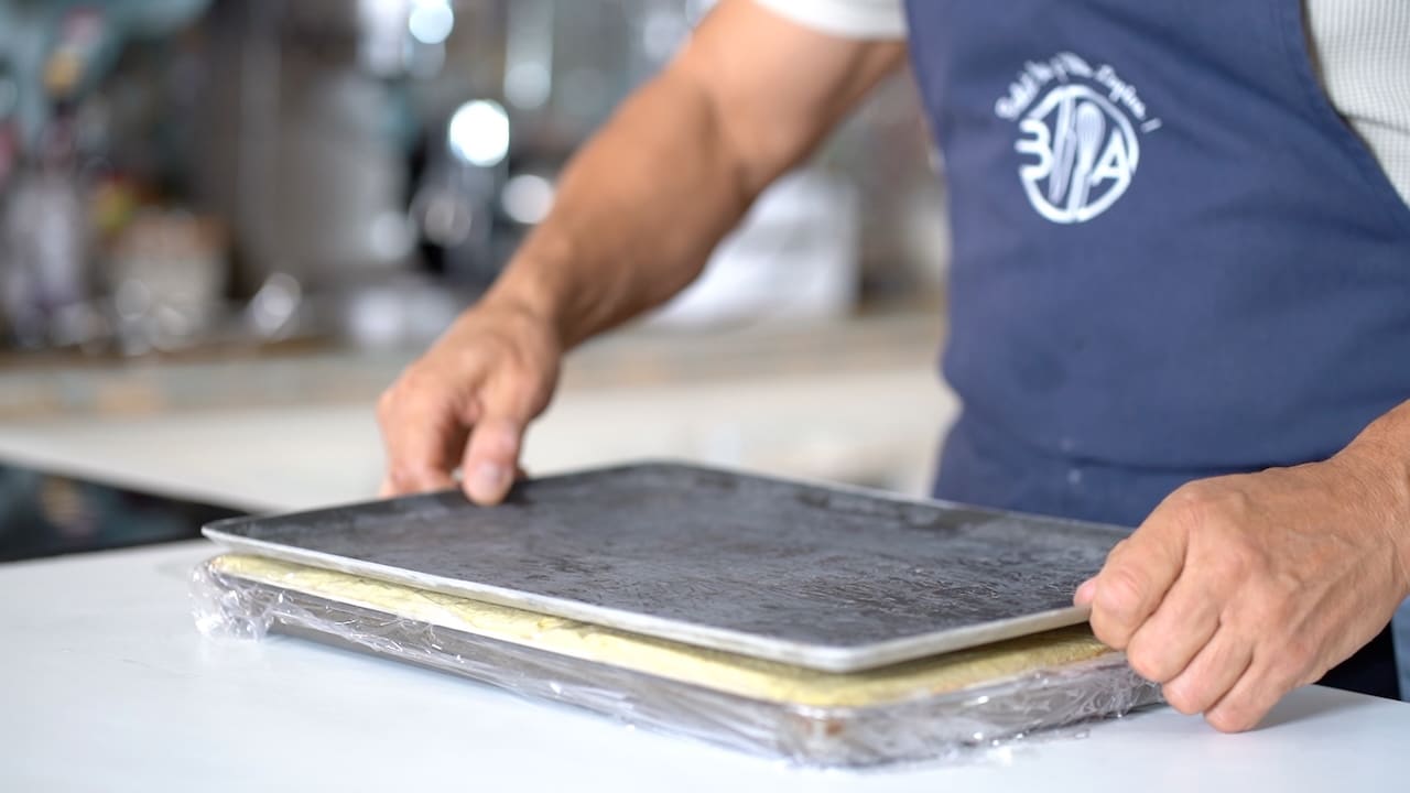 - Cover the cake with plastic wrap and a baking tray, and gently press down. Freeze cake overnight.