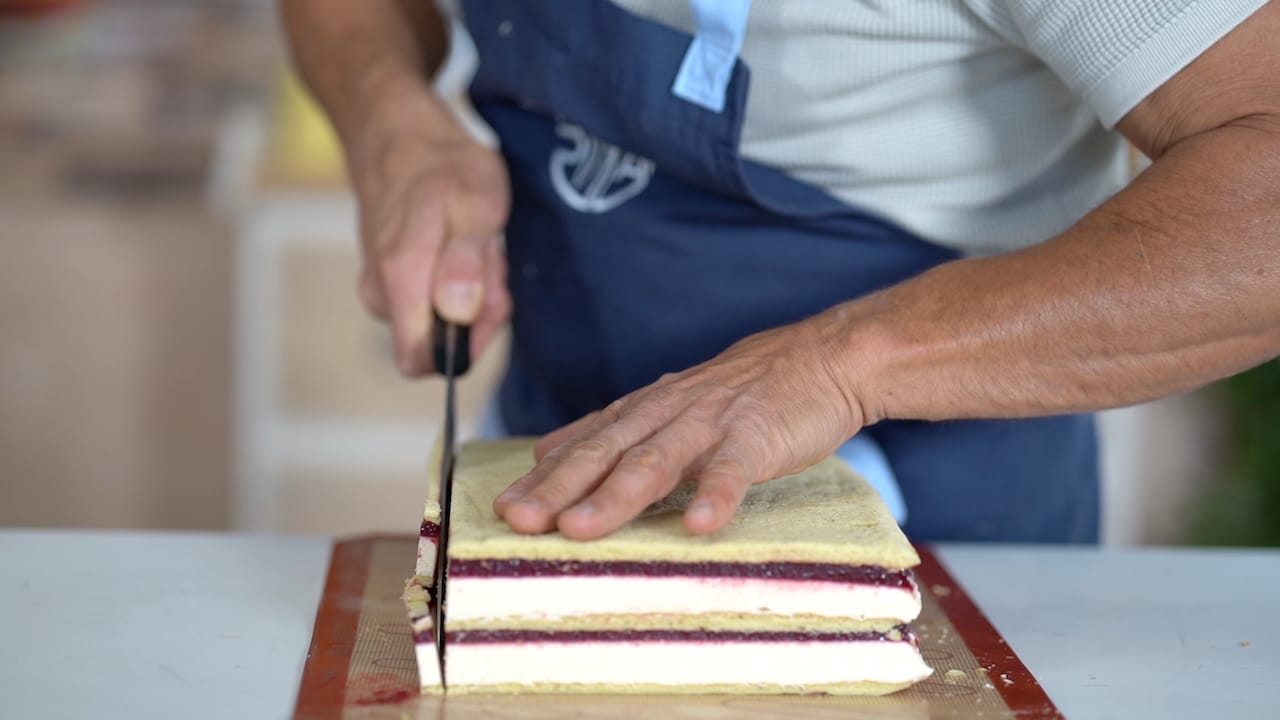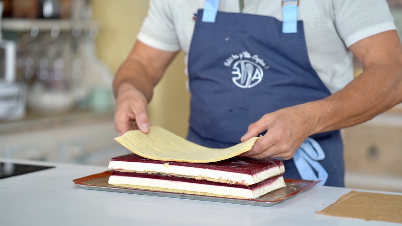 - Top the cake with another pistachio sponge sheet cut in half. Brush with some mimosa cocktail. Now, your cake has 2 layers of mousse, 2 layers of red fruit jelly and 3 layers of pistachio sponge.
