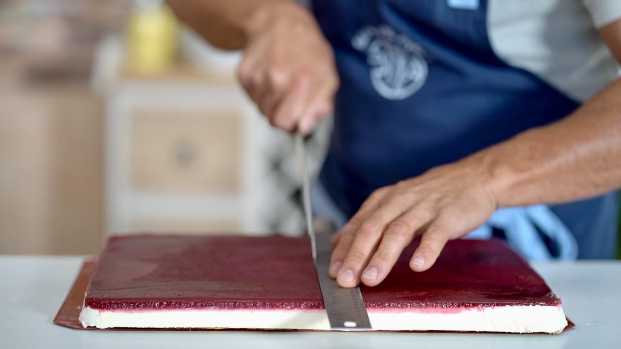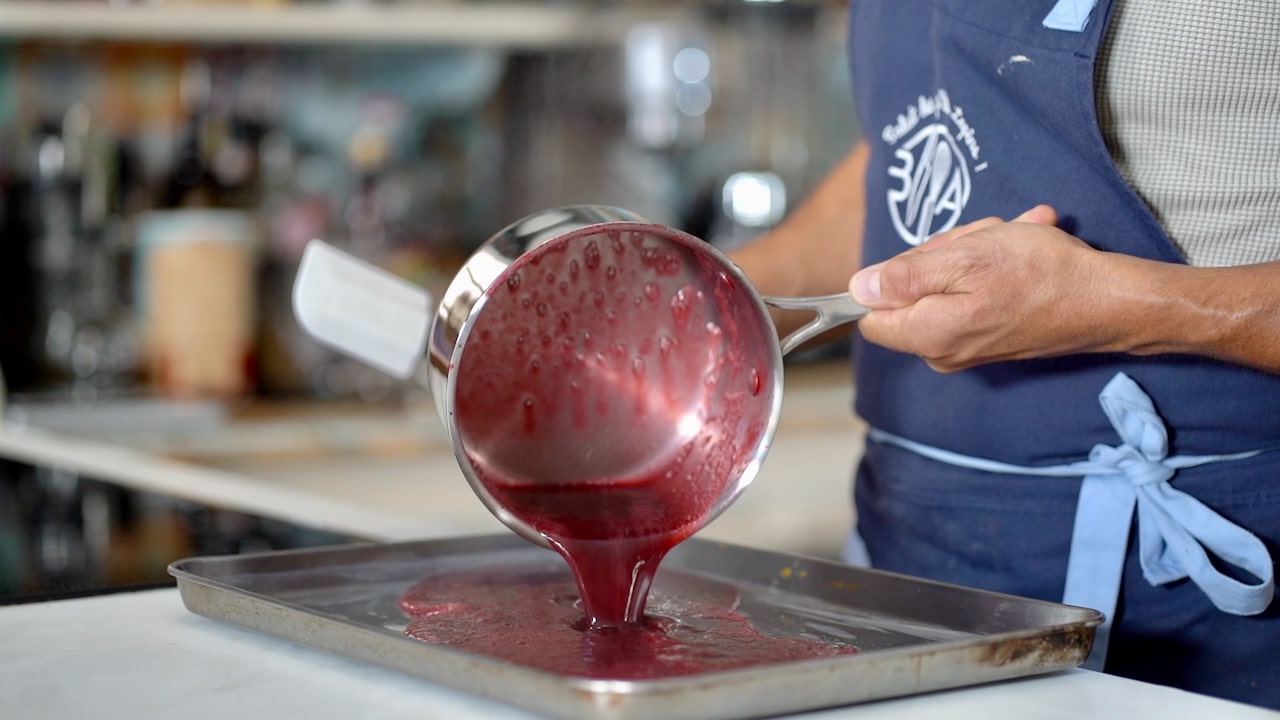 - Place your gelatin sheets in cold water. Let them soak for about 10 minutes. Drain the bloomed gelatin and squeeze out excess water; set aside.Prepare the rimmed baking tray: Oil it lightly and line it with a sheet of acetate or a large freezer bag, smoothing it out to avoid wrinkles. Avoid plastic film. In the small saucepan, bring to a boil the fruit puree with the sugar. Cook for a minute. Remove from the heat, and add the bloomed gelatin. Pour the red fruit mixture in the prepared baking tray. Let cool to room temperature and refrigerate overnight. Make sure that your refrigerator is perfectly leveled, otherwise you may end up with one side thicker than the other.