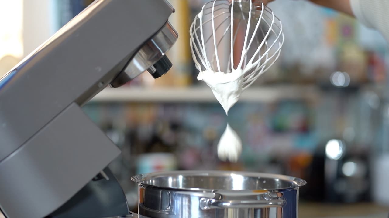 - In the stand mixer fitted with the whisk attachment, whip the cold heavy cream to soft-medium peaks. Transfer the supple whipped cream to a large bowl, and refrigerated. Keep aside the mixing bowl and whisk uncleaned for the Champagne mousse.