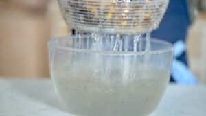 - Mushrooms can be rinsed under running water and briefly soaked in water. Fill a salad spinner, large bowl, or bucket with lukewarm water. Transfer the trimmed chanterelles into the water. Gently swirl them around and let them soak for 30 seconds. Dirt and debris should begin to settle at the bottom. Lift the mushrooms out, discard the dirty water, and repeat the process with fresh water once more.