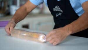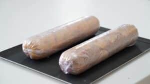 - Cut the log in half, and re-wrap tightly in cling film, and seal the ends firmly.