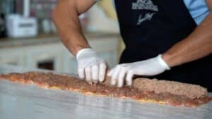- Spread the stuffing onto a baking tray lined plastic wrap and refrigerate.